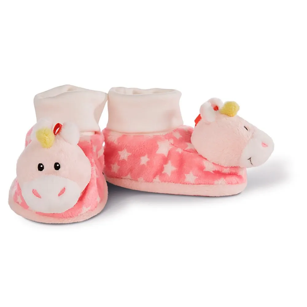 The cute baby shoes with unicorn Stupsi keep your babie´s feet warm. They are made of delicate NICI plush and have a sock made of cotton in them. The unicorn-heads have little bells in them and keep babies busy and entertained.