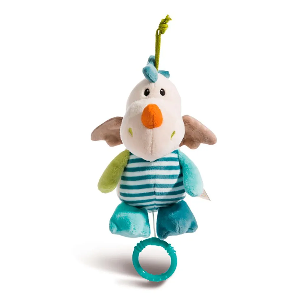 From birth, children playfully discover the world, using all their senses. My First NICI is specifically geared to the needs and requirements of every stage of baby’s development and can support these first steps in learning by stimulating the senses with selected toys, supporting the synapse formation in the brain. The lovingly designed cuddly toys and educational toys are made of high-quality plush and developed by experienced designers who are parents themselves. NICI sets great value upon excellent product quality and the latest safety standards. This is why each product is thoroughly tested and certified by an independent testing institute. The music box Drache Draguli not only consists of super soft plush for touching, cuddling and loving, but also plays an enchanting lullaby at a pleasant volume when the handrim is pulled. So baby can easily be calmed, comforted and gently lulling to sleep with Schubert´s familiar lullaby.